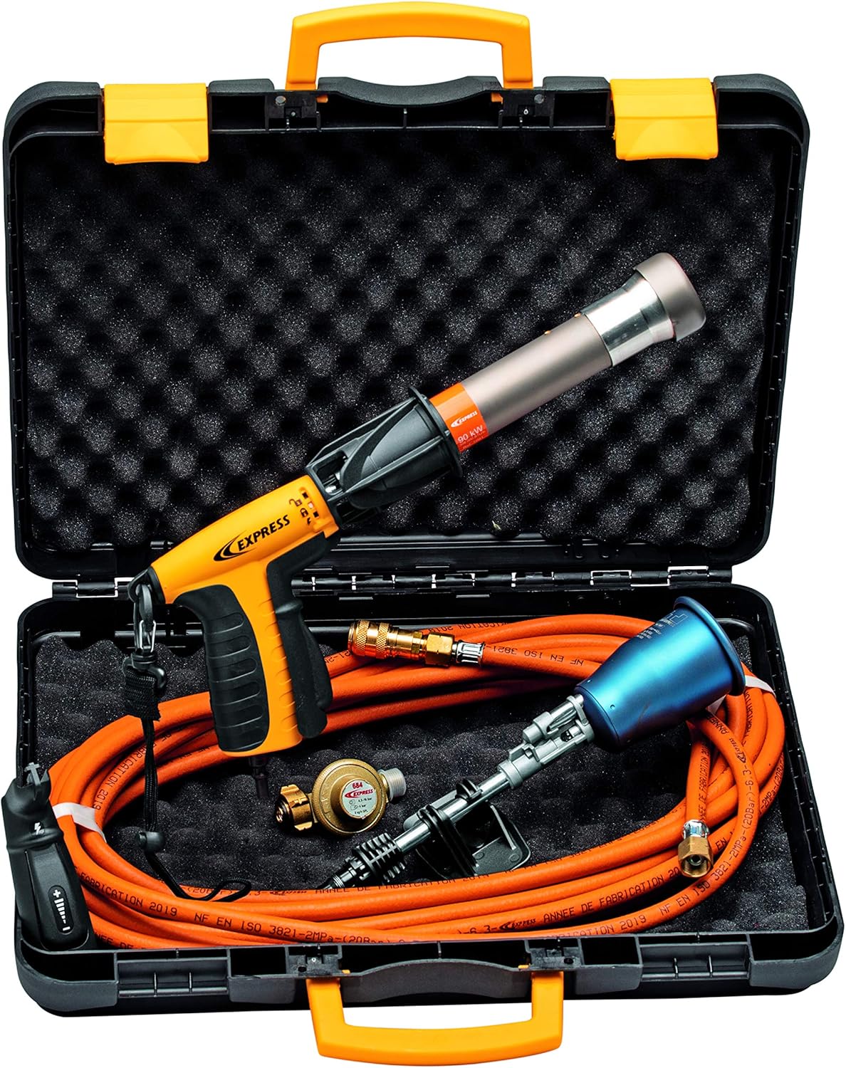 Profesjonalny zestaw do obkurczania folii termokurczliwej renomowanej marki Express, łączący dwa palniki – Hornet 90 kW i Wizz 100 kW. Nowoczesna konstrukcja umożliwia szybką wymianę końcówek i palników bez użycia narzędzi.